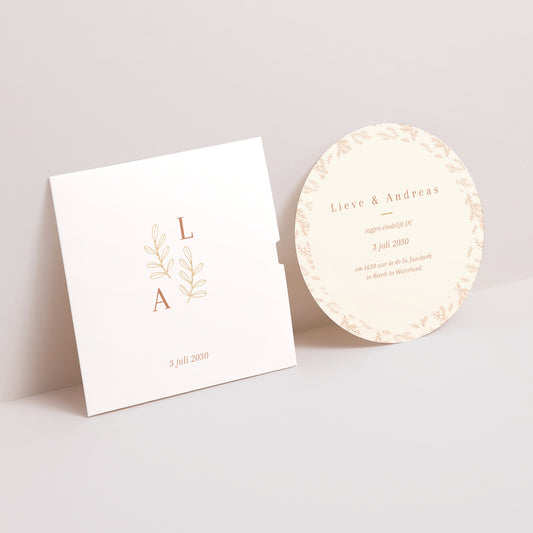 Trouwkaarten Vierkante tas, 3 kaarten, labelgouden bladerenNormale prijs Vanaf 2,59 €